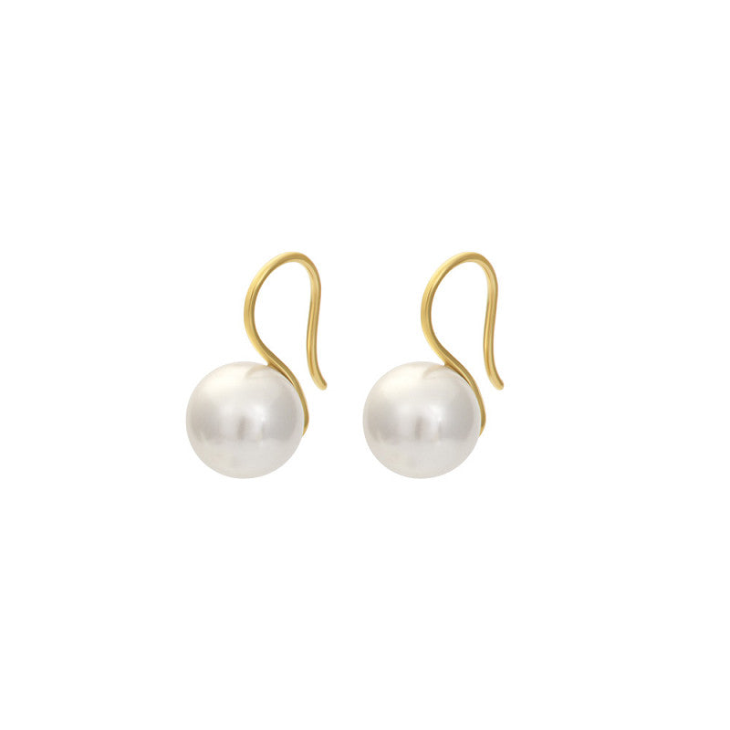De oorbellen bestaan uit verfijne stekers met een ronde parel die rust op een sierlijk gebogen oppervlak.